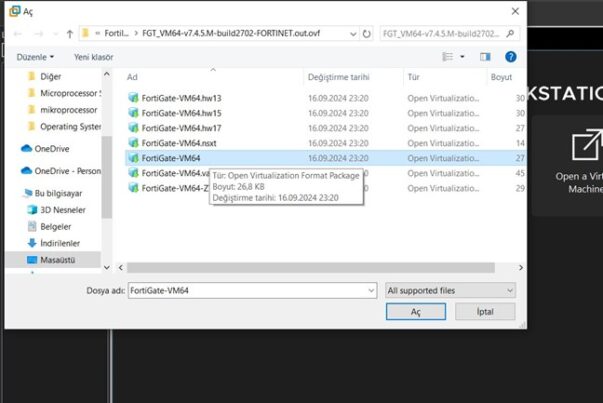 5. İndirdiğimiz Klasörün içine gidip ‘FortiGate-VM64’i seçiyoruz.