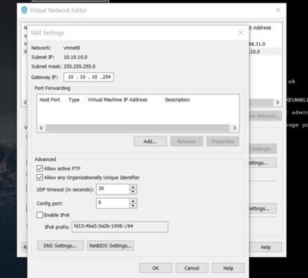 9. Cihazımızın interface ve ip configurasyonlarını yapmak için VMWare à edit à virtual network editor seçeneğinden verebileceğimiz ip adresi ve default gateway adresini öğreniyoruz.