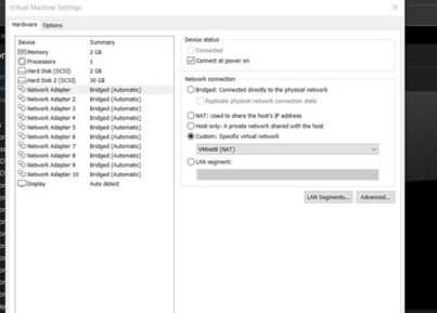 6. Sanal makineyi import ettikten sonra Network Adapter’ı açıyoruz ve Custom: Specific virtual network’te Vmnet8(NAT)’ı seçiyoruz.